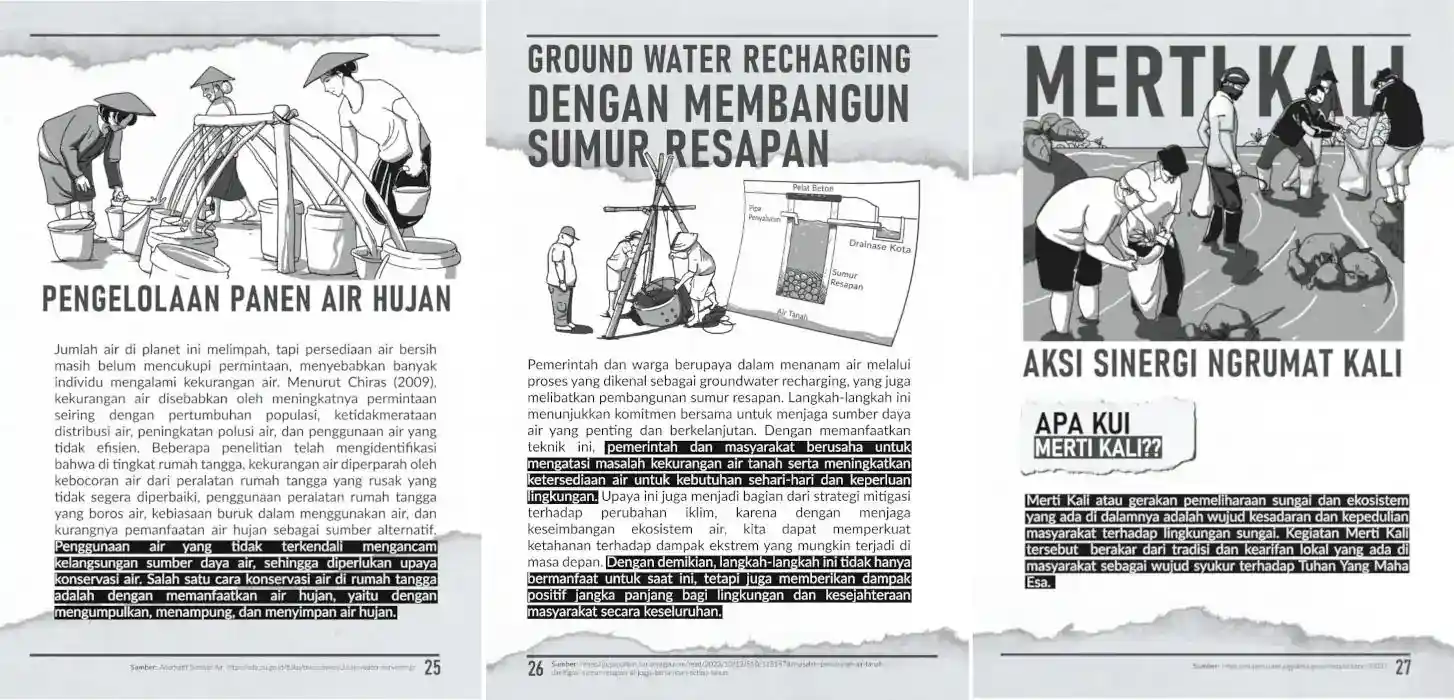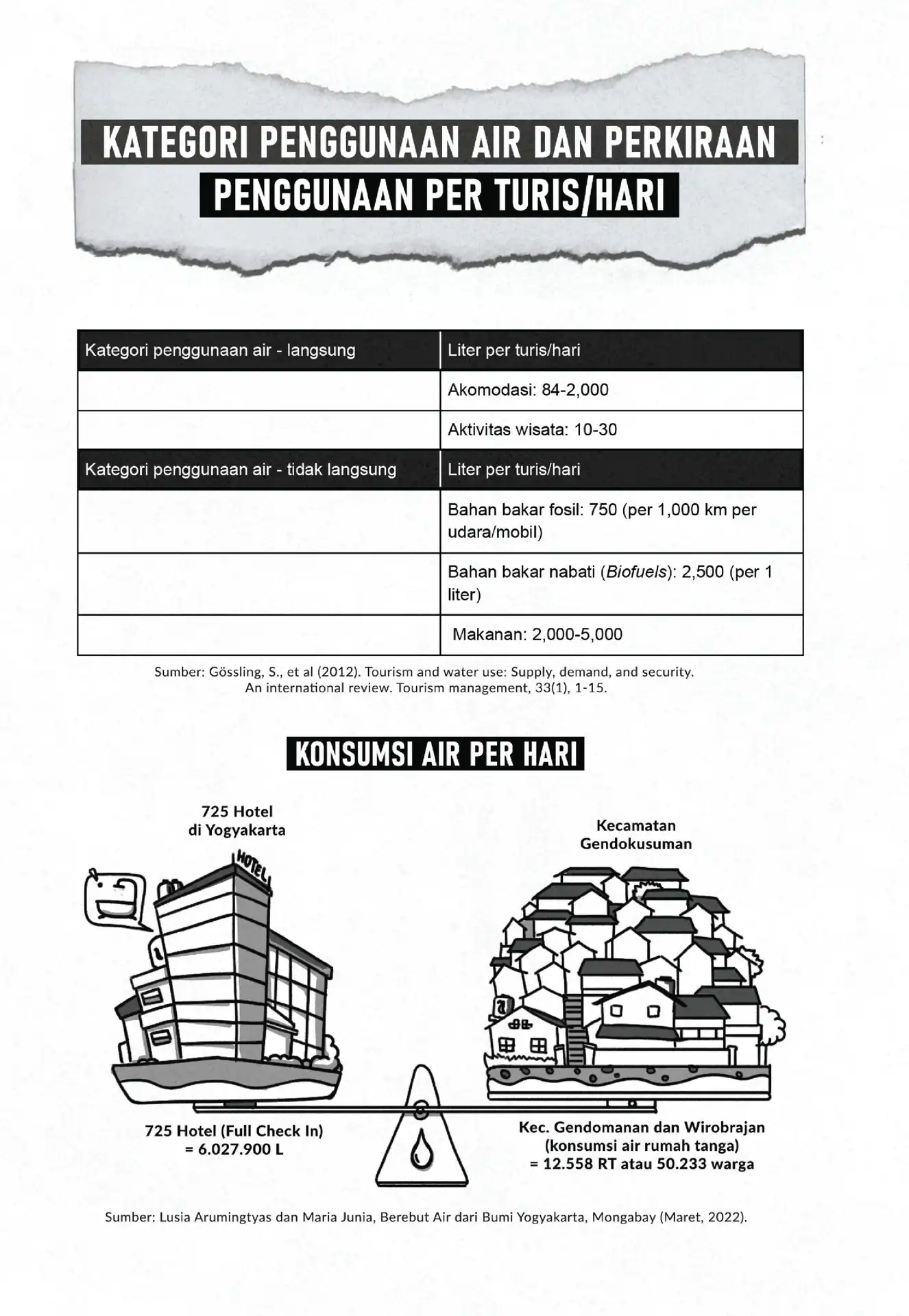 Industri pariwisata menggunakan jumlah air yang signifikan, dan pertumbuhannya yang tidak terkontrol dapat mempengaruhi kuantitas dan kualitas air di destinasi wisata. Peningkatan pariwisata global dan kegiatannya, yang menggunakan lebih banyak air, bersamaan dengan perubahan dalam sistem iklim global yang mengarah pada penurunan sumber daya air. Beberapa destinasi, termasuk di Yogyakarta, Indonesia, berisiko mengalami stres air dimasa depan. Tekanan untuk mengelola kebutuhan air, akibat dari peningkatan permintaan pariwisata, berdampak terhadap akses air warga dan menimbulkan konflik. Tata kelola partisipatif dari pengelolaan air memerlukan informasi yang memadai, termasuk kondisi ketersediaan air umum dan aktual, penggunaan sektor domestik, industri, dan pariwisata, makna dan kearifan lokal atas air. Masyarakat sipil memainkan peran penting dalam tata kelola air, dan penyebaran informasi yang memadai, menggunakan media dan metode yang tepat, diperlukan untuk mempromosikan partisipasi masyarakat. Buku saku dapat berfungsi sebagai media yang cocok untuk memperkuat kapasitas masyarakat tentang tata kelola air. Oleh karena itu, kami bekerjasama dengan Lingkar Keadilan Ruang Yogyakarta, membuat buku saku pariwisata dan air untuk meningkatkan kesadaran dan kapasitas warga dalam tata kelola air perhotelan dan pariwisata di Yogyakarta. Buku ini berguna untuk kampanye, advokasi, dan penguatan kapasitas warga. Buku ini juga bisa digunakan sebagai bahan ajar untuk mahasiswa jurusan Pariwisata, Desain Komunikasi Visual, dan Studi Pembangunan. Mahasiswa dapat mempelajari tentang pembangunan pariwisata berkelanjutan yang berbasis pada masyarakat lokal. Selain itu mahasiswa juga dapat mempelajari desain media yang aplikatif untuk kampanye, advokasi, dan penguatan kapasitas warga mengenai isu lingkungan hidup, khususnya air.